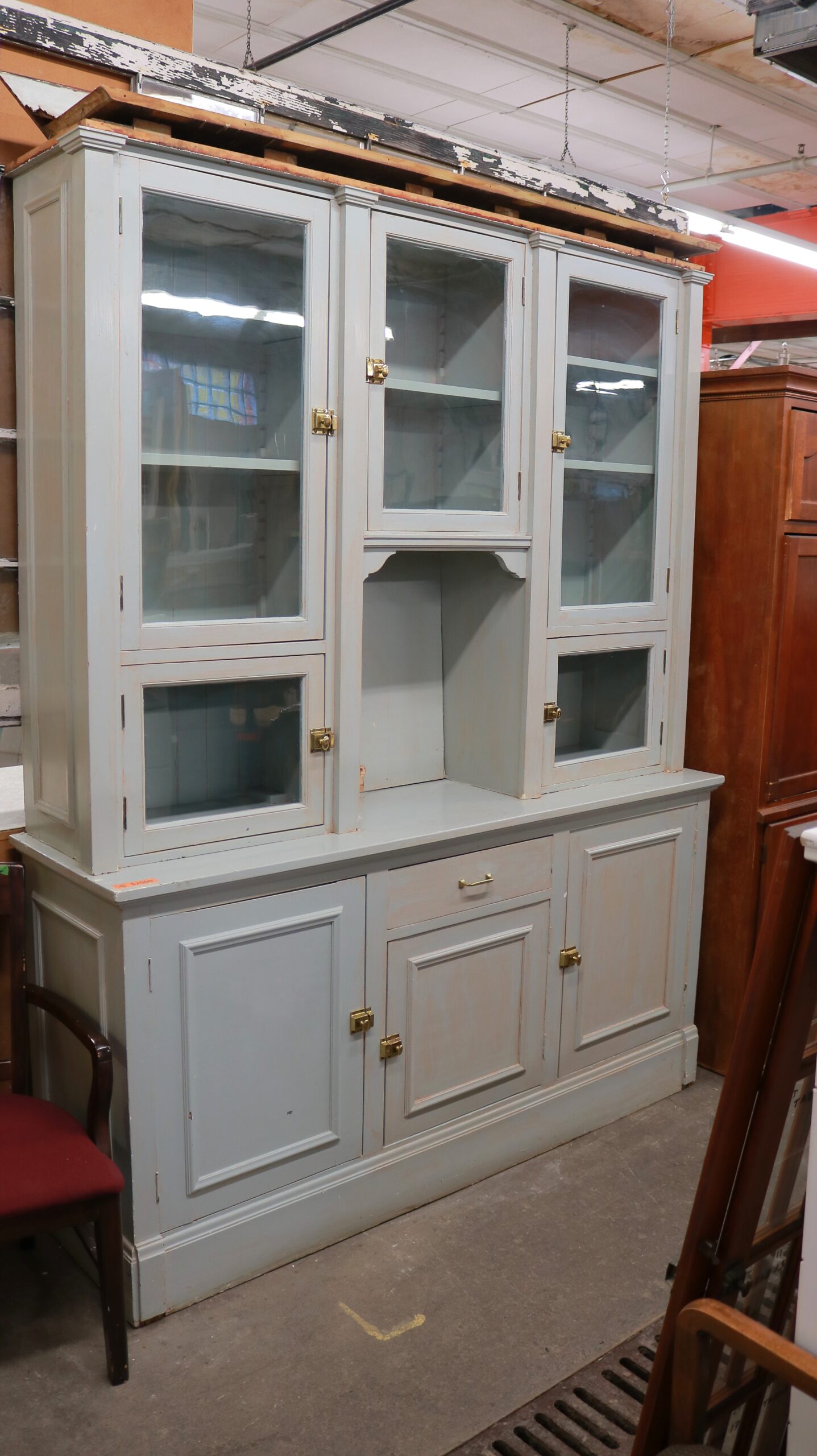 This charming two-piece hutch combines classic farmhouse style with practical storage. Finished in a soft gray-blue paint with a gently distressed patina, this piece brings vintage character to any dining room or kitchen.
